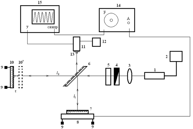 Юстировочными винтами (9) зеркала (10) совмещаем оба пятна и наблюдаем на осциллографе (15) интерференционную картину, по ней вычисляем максимум и минимум.