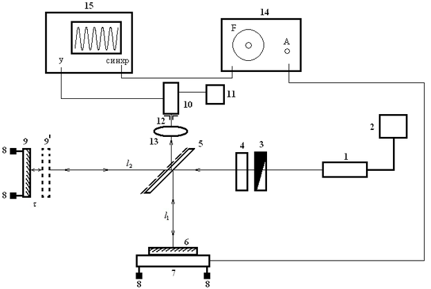 Юстировочными винтами (8) зеркала (9) добиваемся максимальной амплитуды интерференционного сигнала на осциллографе.