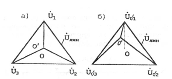 а) принципиальная схема; б) схема замещения Прикосновение человека к одной из фаз нарушает симметричный режим сети и вызывает так называемый перекос фаз - напряжения разных фаз относительно земли становятся неодинаковыми. На рис.7, показано как меняются вектора напряжений при прикосновении человека к 1 фазе. Значение тока Ih можно определить, напряжение этой фазы относительно земли.