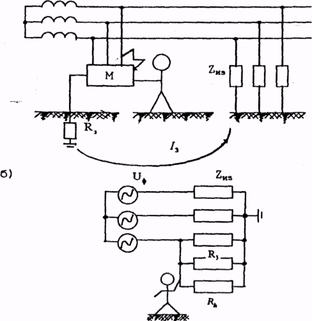 Iз = 3 * Uф / ( 3 * Rз + Zиз ) . Ток, проходящий через тело человека:
