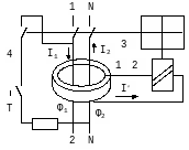 При возникновении дифференциального тока (напр., тока утечки на землю или тока через человека при прикосновении к токоведущим частям) баланс токов, а следовательно и магнитных потоков, нарушается и во вторичной обмотке появляется ток, который вызывает срабатывание порогового элемента, воздействующего на исполнительный механизм (3). Последний отключает питание и защищаемая цепь обесточивается.