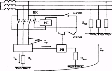 Если это напряжение превысит напряжение уставки реле РН Uуст, то реле за счет тока Iр сработает, разомкнув своими контактами цепь питания магнитного пускателя МП. А силовые контакты магнитного пускателя, в свою очередь, обесточат поврежденное оборудование, т.е. УЗО выполнит свою задачу.
