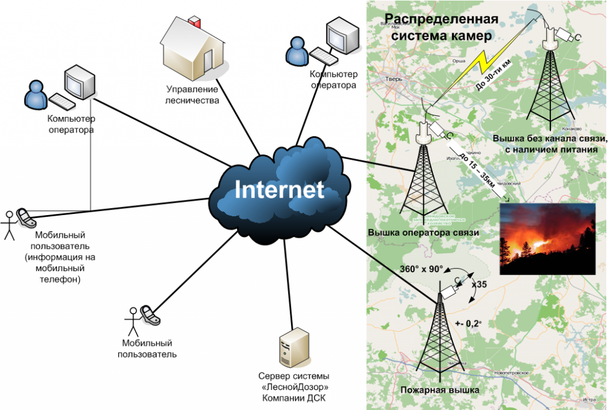 «Лесной Дозор» работает следующим образом. На неспециализированных высотных сооружениях (вышках операторов сотовой связи, провайдеров связи, телевизионных, радиовещательных, вышках наземного мониторинга) размещаются управляемые видеокамеры с широким диапазоном приближения изображения и возможностью дистанционного управления через сеть Интернет (вращение, приближение удаление, запись). В любом удобном месте размещается центр контроля (с возможностью высокоскоростного подключения в сеть Интернет), в котором находится оператор и с помощью специального программного обеспечения управляет системой камер и обнаруживает пожар. Кроме того, система позволяет распределять нагрузку по нескольким операторам, что позволяет повысить качество обнаружения. Система легко расширяется, и пригодна как для задач обнаружения лесных пожаров на небольших территориях, так и для задач мониторинга обширных областей.
