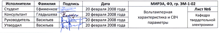 | Студент | Ефименков | 20 февраля 2008 года | Вольтамперная характеристика и СВЧ параметры | Лист №6 | |