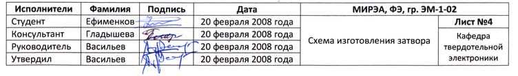 | Студент | Ефименков | 20 февраля 2008 года | Схема изготовления затвора | Лист №4 | |