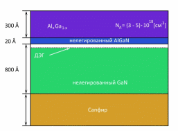 ), не ограничены по диаметру пластин и легко поддаются утоньшению, что упрощает формирование в них сквозных отверстий. Кроме того, они перспективны для изготовления комбинированных схем, сочетающих Si и GaN-элементы. Главная трудность при использовании кремниевых подложек – получение в ходе эпитаксии качественного переходного слоя GaN/Si, что обусловлено сильным различием коэффициента теплового расширения и параметров решетки этих двух материалов. Тем не менее, фирмами Японии, Китая, США, Германии и Франции активно и успешно исследуются возможности применения кремниевой подложки. Так, компания «Nitronex» (США) запатентовала технологию «SIGANTIC», позволяющую выращивать на пластине Si высококачественные эпитаксиальные структуры AlGaN/GaN. Совместно с фирмой «Rockwell Collins» ею создан AlGaN/GaN-транзистор на Si - подложке с Рвых более 120 [Вт] на частоте 2 [ГГц] при Kp = 11,2 [дБ] и КПД более 39 %. На кремниевой подложке фирмой «Daimler Crysler» создан AlGaN/GaN ГПТШ с удельной мощностью
