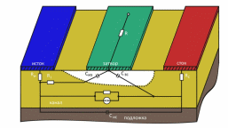 При подаче смещения на выводы полевого транзистора в эпитаксиальном слое образуются обедненный слой с низкой проводимостью. Объемная трехмерная обедненная область, управляемая напряжениями на электродах определяет эквивалентную схему транзистора, а также зависимости элементов эквивалентной схемы от напряжений (рисунки 7, 8).