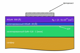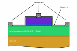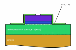 Напыление системы металлизации для создания омических контактов Ti-150Ǻ/Al-500Ǻ/Pt-200Ǻ на установке катодного и магнетронного распыления металлов.