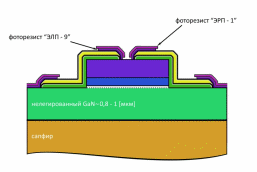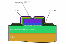 Фотолитография «Исток-сток (выход на необходимую толщину) – Ti-Au 0.06 мкм, 0.2 Au мкм»
