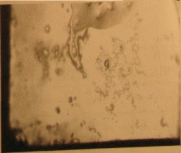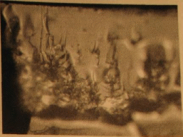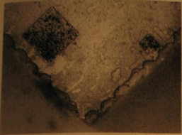 Процесс проводился в МГАПИ (г. Москва). Нагрев поверхности пластины лучом инфракрасного лазера с последующим охлаждением жидкостью приводит к раскалыванию пластины по линии перемещения лазерного луча. Внешний вид кромки и боковой грани кристалла транзистора представлены на рисунках 33, 34. Кромка практически не имеет сколов, а боковые грани имеют зеркальнную поверхность. Процесс резки более «мягкий» по своему воздействию на активную область транзистора и выглядит предпочтительнее.