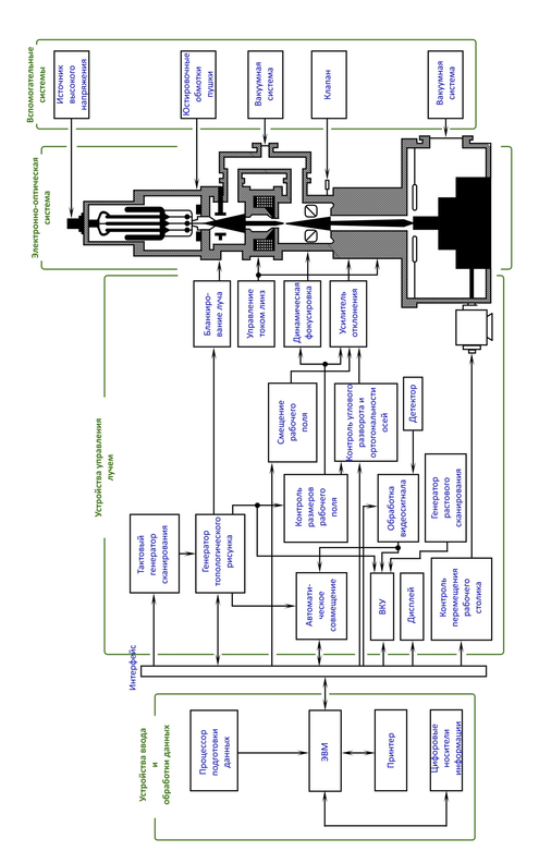 Для формирования топологического рисунка с субмикронными размерами элементов диаметр электронного пятна на поверхности резиста должен составлять 0,01 - 0,05 [мкм]. Далее, чтобы экспонирование резиста проходило без чрезмерных затрат времени, плотность тока в этом пятне должна быть порядка 10 - 100 [А/см2]. Большинство термоэмиссионных источников электронов может обеспечить плотность тока порядка нескольких ампер на квадратный сантиметр (при приемлемом сроке службы) при диаметре катода 10 - 100 [мкм]. Диаметр электронного луча, следовательно, нобходимо уменьшить с помощью системы электронных линз примерно в 104 раз. Кроме того, с помощью отклоняющей системы надо очень точно направлять сфокусированный луч в любую точку на поле сканирования по сигналам генератора топологического рисунка, управляющего работой установки. Электронно-лучевые установки были разработаны на основе сканирующих электронных микроскопов, которые получили широкое распространение в научных исследованиях с начала 60-х годов. Действительно, многие ЭЛУ, эксплуатирующиеся в настоящее время, представляют собой сканирующие электронные микроскопы, приспособленные для формирования топологического рисунка, В последние годы, однако, разрабатываются установки, предназначенные специально для ЭЛЛ, прн этом основное внимание уделяется повышению их производительности.