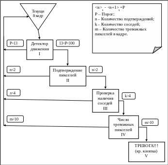 Каждую минуту выхваченный кадр становится опорным, а все последующие попиксельно сравниваются с ним. В случае, если разница между пикселями по показателю яркости выше порога (<n>ij - <n+1>ij), то эти пиксели сохраняются для дальнейшей обработки. Порог в данном случае нужен для того чтобы учесть всевозможные шумы. Еще следует отметить, что данный детектор является двух пороговым, т.е. помимо минимального(по умолчанию он равен 13 единицам), есть еще и максимальный (100 единиц), что позволяет избежать реакции на блики на стеклах домов или включение фонарей вечером. Сам же показатель яркости может принимать значение от 0 до 255. Это есть не что иное, как самый простейший детектор движения (I).