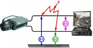 Синфазные помехи также отрицательно воздействуют на цепи питания видеооборудования. Поэтому на промышленных объектах длинные цепи питания постоянным током рекомендуется прокладывать в экране. Воздействие наведённых напряжений Е1 и Е2 на центральную жилу и оплётку кабеля, приводит к возникновению напряжения помехи ЕЗ, суммирующуюся с полезным видеосигналом. Значение ЕЗ зависит от величины наведённых помех Е1 и Е2, параметров линии связи и множества других факторов. Синфазные помехи присутствуют в любой системе видеонаблюдения, как правило не вызывая существенных искажений изображения. Другое дело, когда результат их воздействия становится неприемлемым с точки зрения качества результирующего видеоизображения, и необходимо принимать меры, исключающие негативные явления.
