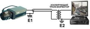 Очевидно, что для устранения искажений необходимо разорвать все «паразитные» контуры заземления. Существует несколько способов устранения «блуждающих» токов по цепям заземления видеооборудования. Во-первых, применяются видеокамеры с изоляцией корпуса и разъёмов от заземлённого кожуха и кронштейна. Оплётка кабеля и разъём подключения к видеокамере должны быть тоже изолированы от земли. Но при питании камеры в удалённой точке от электросети 220В / 50 Гц всё равно образуется «паразитный» контур через ёмкости блока питания камеры и нулевого провода электросети. Поэтому белее правильно передавать видеосигнал от камеры через гальваническую развязку. Наиболее распространены изолирующие видеотрансформаторы и оптоэлектронные развязки. Схема включения изолирующего видеотрансформатора в состав системы видеонаблюдения приведена на (рис.1.16).