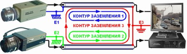 Очень распространённой причиной помех в системах видеонаблюдения являются «блуждающие» токи заземления. Физический принцип образования помехи крайне прост. Рассмотрим механизм образования помехи на примере системы наблюдения, состоящей из видеокамеры, линии связи на базе коаксиального кабеля и монитора. В данной системе реализуется несимметричная схема передачи видеосигнала, при которой оплётка кабеля выполняет функции второго проводника для передачи видеосигнала и высокочастотного экрана