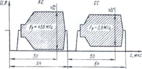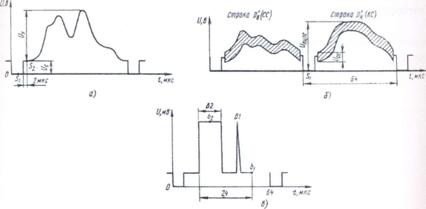 Размах полного цветового ТВ сигнала Uпцтс определяется косвенно суммированием размахов сигналов яркости, синхронизирующих импульсов и максимальной амплитуды сигнала цветности (в КС) на строчном гасящем импульсе рис. 1.1,б: Uпцтс= Uγ+Uc+0,5Uсц