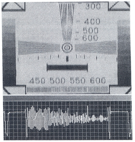 Муары на изображении тест-таблицы и осциллограмма строки в центре горизонтальной миры 450 - 600 телевизионных линий (муары выражаются в низкочастотной модуляции осциллограммы).