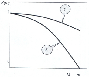 Рис.5.5 Частотно-контрастные характеристики: 1-при наилучшей, 2-при наихудшей фазах испытательной миры относительно дискретной структуры ПЗС