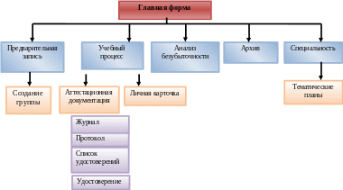 В связи с тем, что при решении задачи используется технология обработки информации в режиме диалога, взаимодействие пользователя с программой можно представить в виде схемы диалога. Данная схема представлена в виде дерева форм, к которым обращается пользователь при работе с АРМ, и изображена на Рисунке 3.2 [3.7].