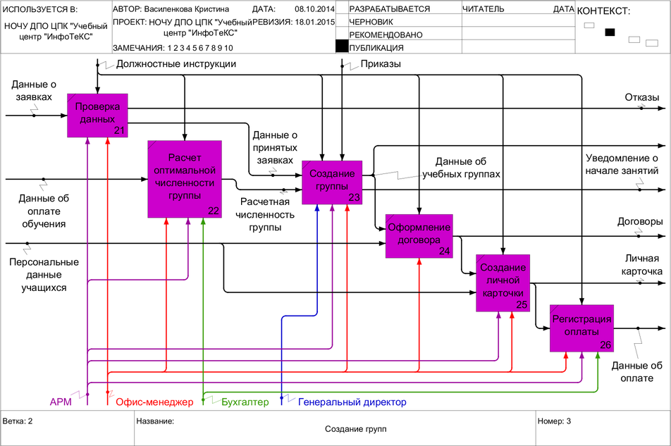 Декомпозиция процесса «Создание групп» представлена на Рисунке 2.3. На данном этапе происходит проверка данных, полученных из заявок на обучение. Если выясняется, что информация не полная или не соответствует требованиям организации, то секретарь сообщает об этом клиенту. До начала занятий все отмеченные недостатки должны быть устранены. Занятия начинаются после того, как будет набрано количество заявок, достаточное для организации новой группы. Оптимальная численность группы рассчитывается методами CVP-анализа на основании данных бухгалтерского учета, поступающих из бухгалтерии в виде внешнего файла. Дата начала занятий устанавливается приказом руководства и об этом информируют всех клиентов, чьи заявки были приняты. На первом занятии происходит оформление договора. Данные из него используют для составления личных карточек учащихся. Когда все данные внесены в АРМ, подгружается файл о внесенной плате за обучение, после чего она отражается в личной карточке.