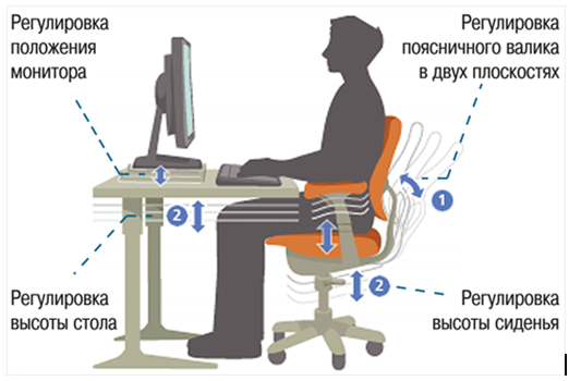 Рабочий стул (кресло) должно быть подъёмно — поворотным и регулируемым по высоте и углам наклона сидения и спинки, а также — расстоянию спинки от переднего края сидения.