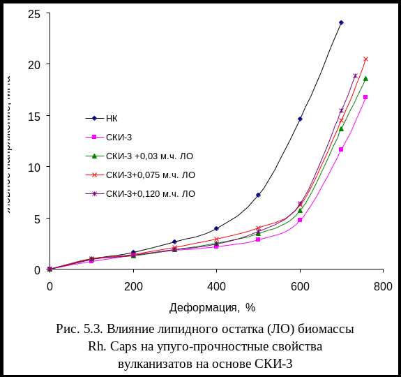 Рассматривая влияние липидного остатка биомассы Rhodobacter capsulatus на зависимость напряжения от деформации было установлено, что у всех образцов резиновых смесей на основе СКИ-3 наблюдается резкий скачок упруго-прочностных характеристик практически при одном и том же значении деформации (рис. 5.5), причем, наиболее заметно положительное влияние 0,075 м.ч липидного остатка биомассы Rhodobacter capsulatus на увеличение условного напряжения.