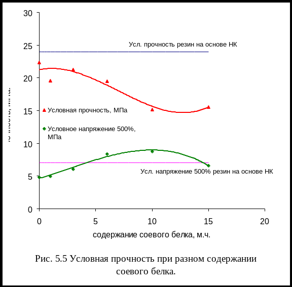 Анализируя влияние различного содержания соевого белка на условное напряжение при 500%-ом удлинении (рис. 5.5), видно что с увеличением масс. ч. соевого белка в резиновой смеси, условное напряжение возрастает и достигает максимума при содержании 10 мас. ч., после чего наблюдается падение данной характеристики. Однако условная прочность резин на основе НК с разным содержанием соевого белка падает, с увеличением его содержания.