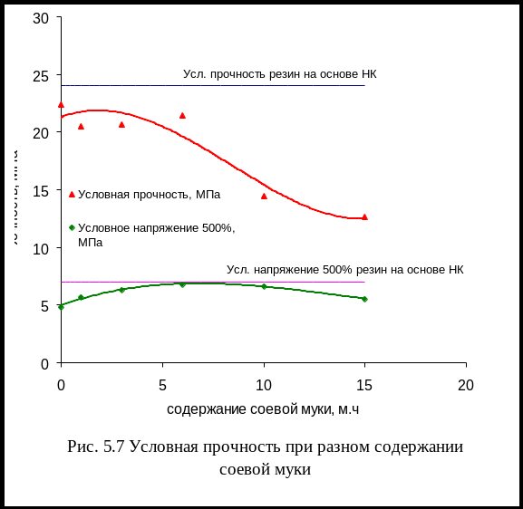 Рассматривая влияние различного содержания соевой муки на условную прочность, видно, что данная величина снижается с увеличением содержания соевой муки в резиновой смеси на основе СКИ-3. Однако условное напряжение при 500%-ом удлинении возрастает и достигает максимального значения при содержании соевой муки 10 мас. ч., но не достигает уровня НК, после чего наблюдается незначительное падение.