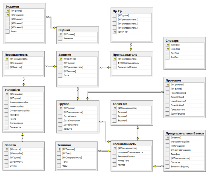 База данных состоит из 15 таблиц, 14 из которых связаны между собой. Так, например, с таблицей «Учащийся» напрямую связаны «Оплата» и «Посещаемость», а с таблицей «Группа» — «Протокол», «Занятие», «Экзамен», «Специальность».