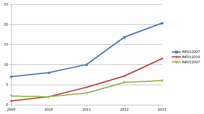 Вот уже на протяжении нескольких лет учебный центр «ИнфоТеКС» основную прибыль получает от обучения по специальности «Администрирование системы защиты информации ViPNet». Это хорошо видно на графике (Рисунок 1.8), построенный на основании исследования данных о доходах учебного центра на протяжении последних пяти лет. На графике изображен график доходов по трем наиболее популярным специальностям: