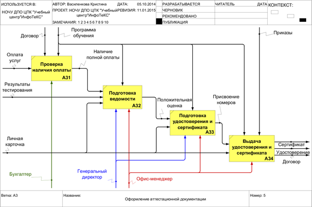 Декомпозиция процесса «Подготовка аттестационной документации» представлена на Рисунке 1.7. На основании данных из договоров, личных карточек и результатов тестирования распечатывают документы об окончании обучения: ведомости, списки, сертификат и другая отчетная документация. Протоколы для экзаменов печатаются предварительно перед экзаменом. Результаты сдачи пишутся вручную на бланке протоколов и в электронном виде не сохраняются.