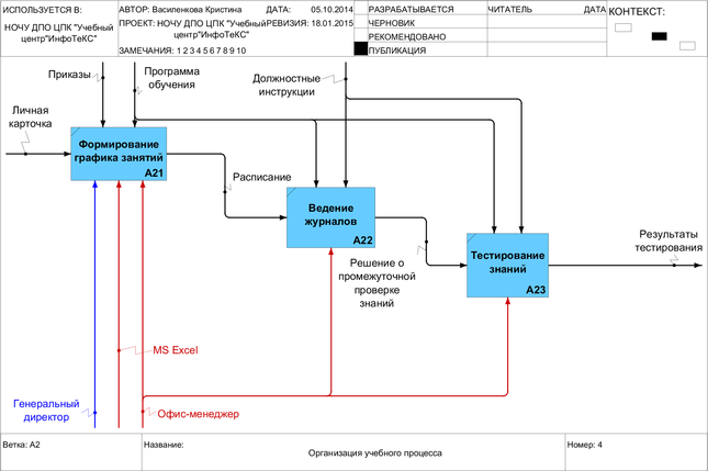 Декомпозиция процесса «Организация учебного процесса» представлена на Рисунке 1.6. После внесения оплаты учащиеся прослушивают теоретический курс и выполняют ряд практических работ. Сроки обучения зависят от тематических планов конкретных курсов. Данные из договоров заносятся в текстовые документы Word и Excel. Сведения об оплате можно получить только при непосредственном обращении в бухгалтерию. Для наглядного отображения данных об оплате распечатывается список, где вручную записывают необходимые данные. Составляется график занятий. Также формируются журналы и тематические планы. Этим занимается административный отдел и руководство. Бухгалтерия отслеживает поступление оплаты. Преподаватели проводят промежуточные тестирования.