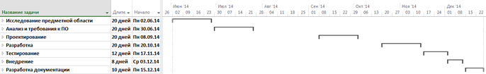 При рассмотрении Рисунка 2.8 и Таблицы 2.2 можно определить сроки разработки АРМ. В расчетах использовались только рабочие дни. На реализацию всех этапов необходимо затратить 110 дней, начиная с 02.06.2014 г. и заканчивая 26.12.2014 г. В частности этап исследования предметной области длится 20 дней, анализ программного обеспечения — 20 дней, проектирование АРМ — 20 дней, разработка — 20 дней, тестирование — 12 дней, внедрение — 8 дней, разработка документации — 10 дней. Трудозатраты составили 880 часов. Основным исполнителем всех этапов создания АРМ является студент-дипломник.