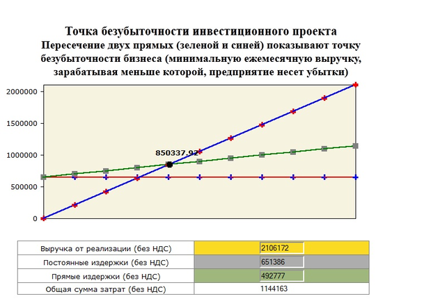 Под точкой безубыточности понимается объем выпуска изделий, при котором сумма затрат на производство (условно-постоянных и условно-переменных) сравнивается с валовым доходом от продаж, и убытки (равно как и прибыль) оказываются равными нулю.