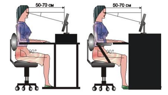 При действии пальцев на клавиатуре, плечи должны быть расслаблены, а руки согнуты примерно под углом 90º, что обеспечивает нормальную циркуляцию крови. Если в кресле имеются подлокотники, убедитесь, что они не слишком подпирают локти и не заставляют поднимать плечи слишком высоко, ущемляя шейные позвонки. Желательно иметь большой широкий рабочий стол. При наличии последнего необходимо расположиться таким образом, чтобы локти слегка свисали с края стола. При этом расстояние от кончика носа до плоскости монитора должно быть не менее 70 см (чем больше, тем лучше).