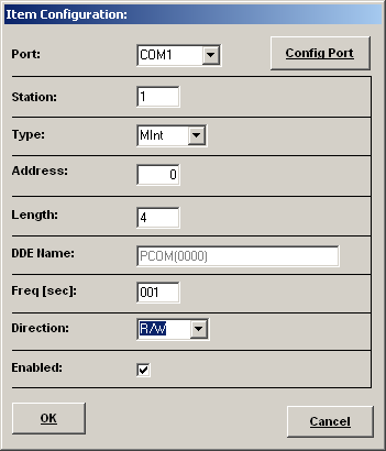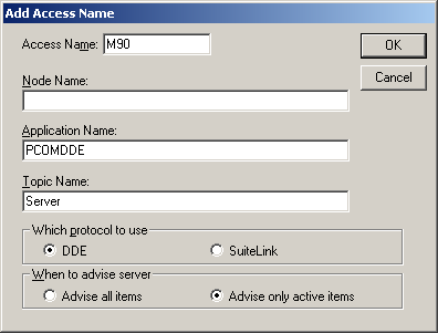 Итак, пусть контроллер М90 подключен к компьютеру и запущен DDE сервер со следующей простой конфигурацией: