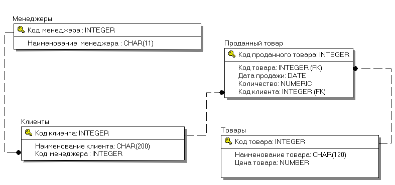 таблица «Проданный товар» содержит данные по коду товара, дате продажи, по количеству, по коду клиента;
