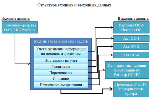 Схема входных и выходных данных представленная на «Рисунок 2.2 – Структура входных и выходных данных». Данными являются объекты основных средств, они выбираются в электронных документах для проведения, в зависимости от вида документа операций.