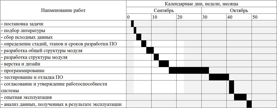 Ленточный график разработки ПО, построенный по данным таблицы 5.2, приведен на рисунке 5.1.