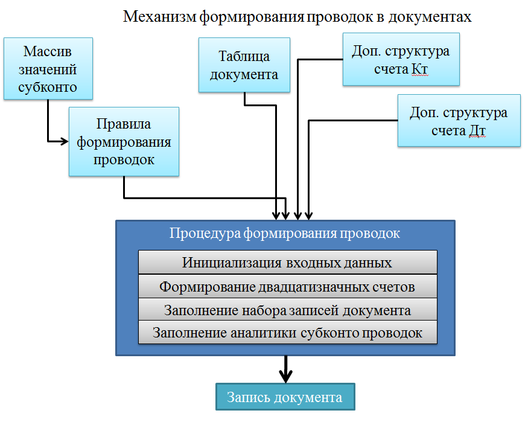 Параметр «Правила формирования проводок» является одним из важных параметров механизма проведения документов системы САХД. Данный параметр представляет собой виртуальный макет формирования каждого вида проводки в документе и является связующим элементом обработки всех передаваемых параметров в процедуру формирования проводок. Объектное представление данного параметра является таблицей, в которой описаны значения или пути поиска значений для ресурсов, измерений и реквизитов, строки набора записей основного регистра бухгалтерии САХД.
