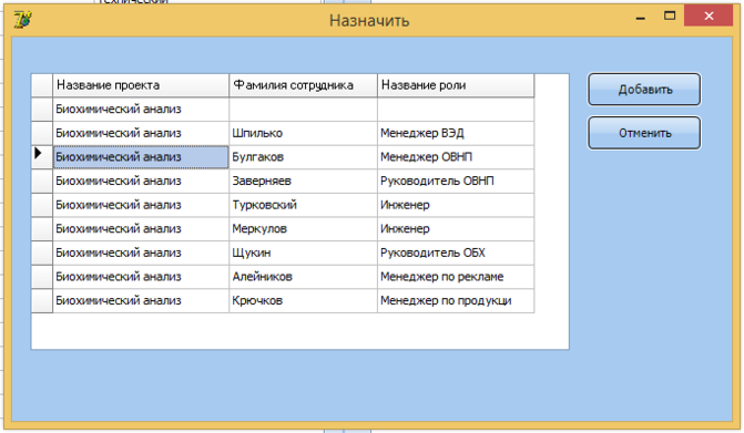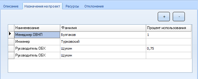 На Рисунке 3.10 представлена форма назначения на проект. Данная форма показывает должность, фамилию, занимающего ее человека и процент использования.
