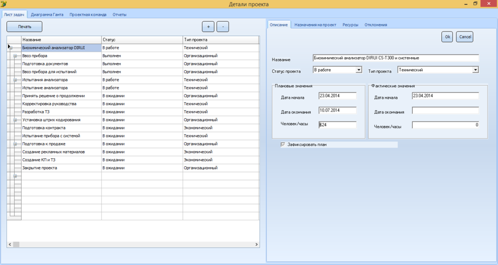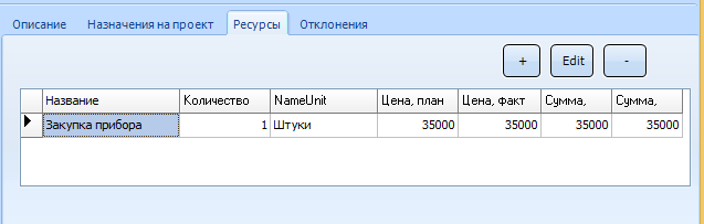 В правой части формы отображаются четыре вкладки: описание, назначения на проект, ресурсы и отклонения.