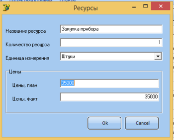 Вкладка «Ресурсы» представлена на Рисунке 3.11. Она отображает название используемых в выбранном проекте ресурсов и предоставляет информацию об их названии, количестве, единицах измерения каждого конкретного ресурса, плановой и фактической цене, а также общей сумме.