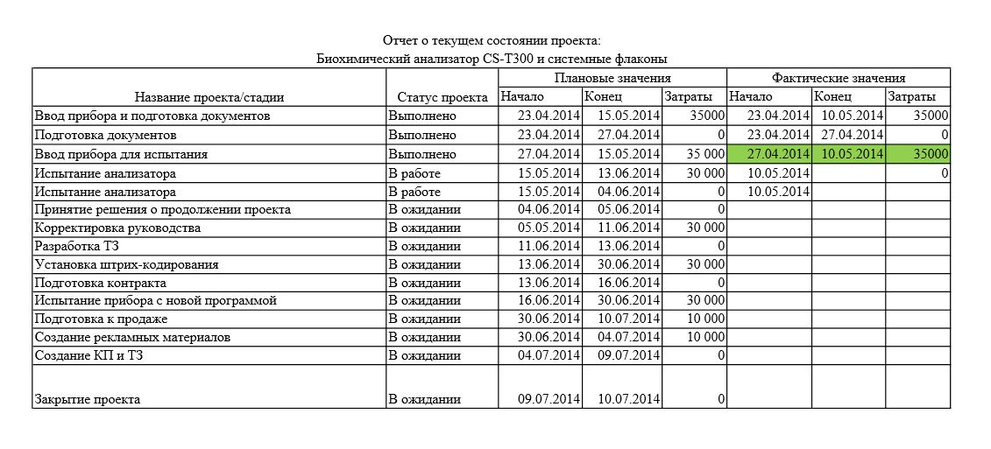 На Рисунке 3.18 представлен отчет о текущем состояни проекта. В нем представлены стадии проекта с их статусов, плановые и фактические даты начала и окончания каждой из стадий, а также затраты на каждую из них.