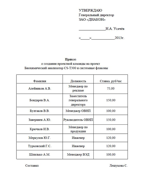 На Рисунке 3.17 представлен приказ о создании проектной команды. Данный приказ содержит информацию о персонале, работающим над конкретным проектом: фамилию сотрудника, его должность и ставку.