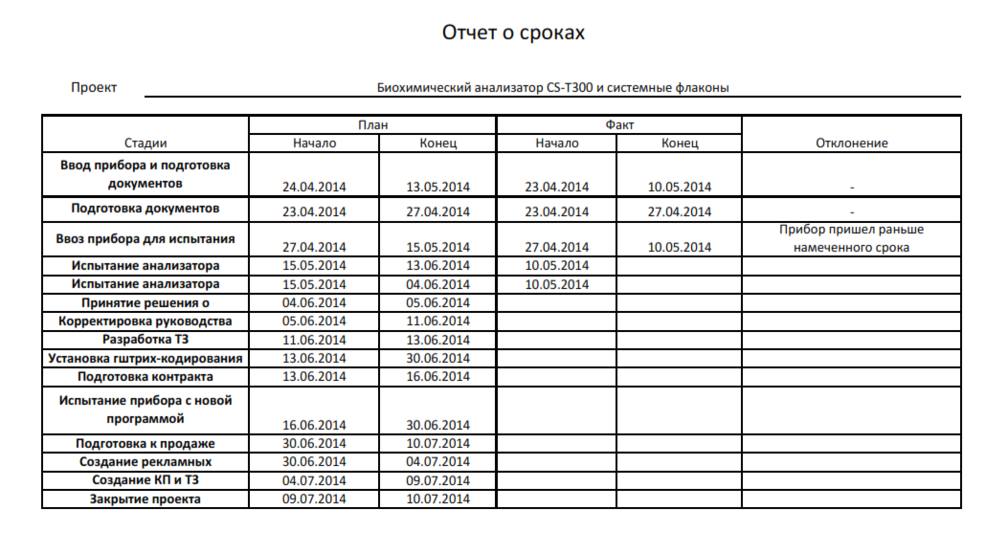 Отчет осроках предоставляет информацию о временных рамках проекта, запланированных датах начала и окончания, а также отражает из фактические значения.