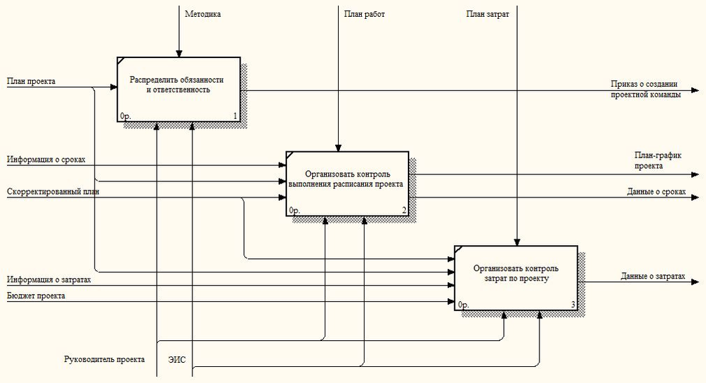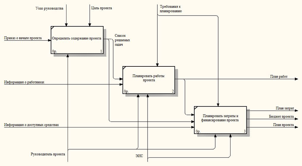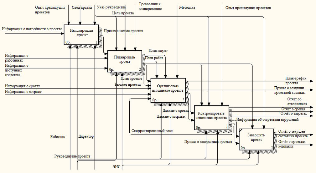На Рисунке 2.1 представлена контекстная диаграмма. Рисунок 2.2 представляет собой детализацию контекстной диаграммы, он отображает основные процессы управления проектами с использованием ЭИС. Рисунки 2.3-2.6 являются графическим отображением детализации процессов системы управления проектами.