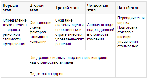 Внедрение системы управления стоимостью достаточно продолжительный процесс, так западные специалисты оценивают его продолжительность в 2-3 года.3 Этот процесс включает в себя 5 основных этапов в соответствии с табл.1.2.