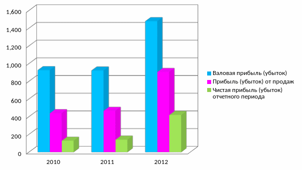 Прибыль от продаж на 31.12.2010 составляла 438 млн. руб. За анализируемый период она возросла на 467 млн. руб. Следует отметить высокий уровень коммерческих и управленческих расходов в структуре отчета о прибылях и убытках организации. На начало анализируемого периода их доля составляла 15.03 % от себестоимости реализованной продукции. Коммерческие расходы возросли на 110%. Показателем повышения эффективности деятельности предприятия можно назвать более низкий темп возрастания себестоимости по отношению к приросту выручки (12% и 22% соответственно). Отрицательным моментом является увеличение убытков по прочим расходам. Чистая прибыль за анализируемый период выросла на 224% и в 2012 году установилась на уровне 419 млн. руб.