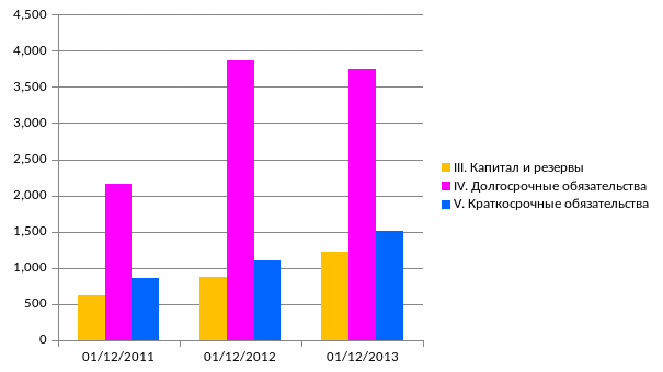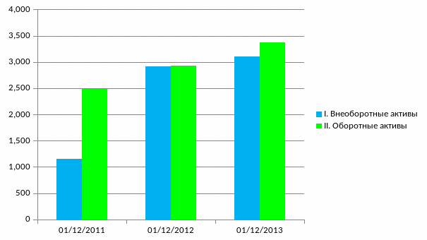 На начало анализируемого периода сумма активов предприятия составляла 3 638 млн рублей. К концу периода, то есть на 31.12.2012, валюта баланса составила 6 481 млн рублей. Активы организации за весь рассматриваемый период увеличились на 78,2%.